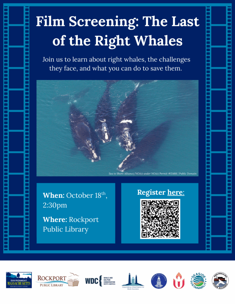 Join Environment Massachusetts Research and Policy Center to watch “The Last of the Right Whales,” to learn about right whales, the challenges they face, and what you can do to save them. Following the screening, there will be a Q&A. Environment Massachusetts Research & Policy Center is one of the state’s leading environmental nonprofits with one mission: to protect the natural world.
